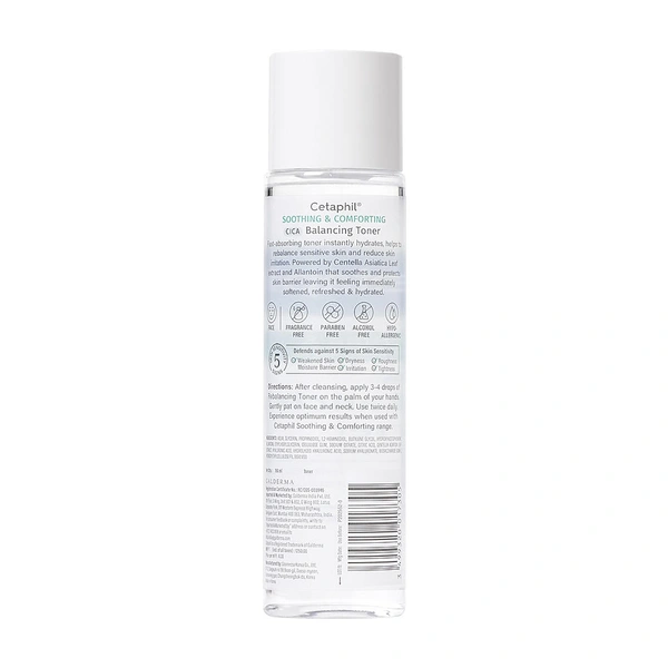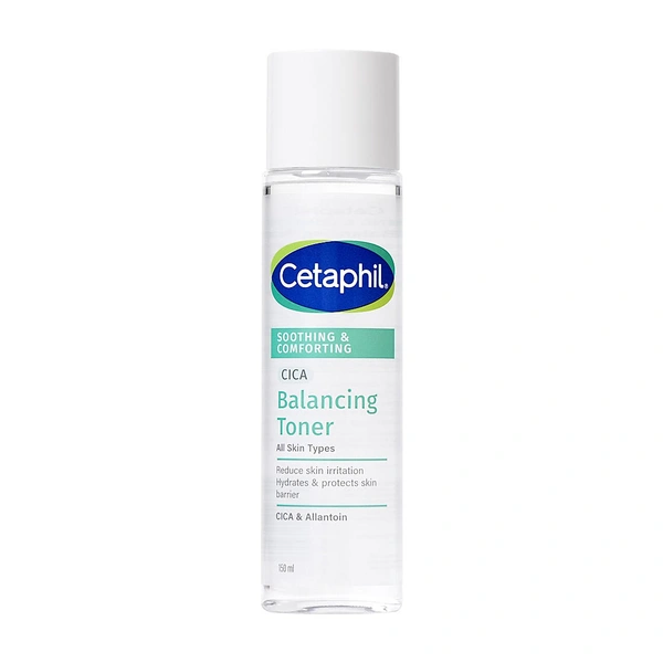 Cetaphil Soothing & Comforting CICA Balancing Toner is a fast-absorbing, skin-stabilizing toner that instantly hydrates and helps rebalance sensitive skin. Enriched with Centella Asiatica (CICA), Allantoin, and Sodium Hyaluronate, it visibly reduces redness and soothes irritation. This fragrance-free, paraben-free, and hypoallergenic formula strengthens the skin barrier, leaving it feeling softened, refreshed, and comforted. Suitable for daily use on sensitive and redness-prone skin.