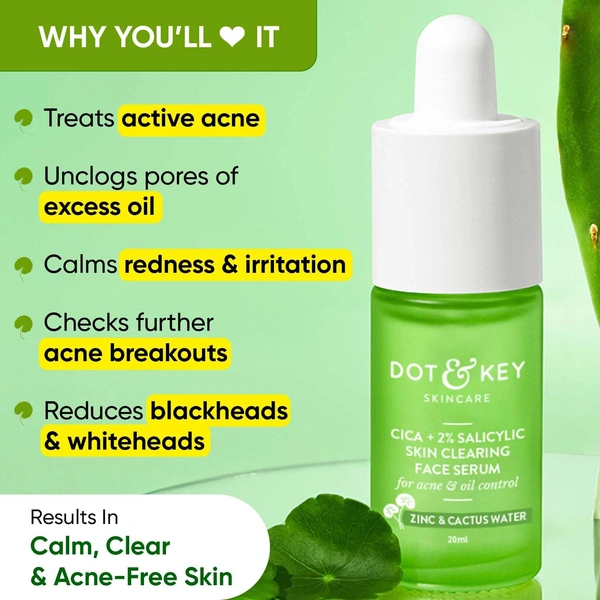 Dot & Key CICA + 2% Salicylic Skin Clearing Face Serum | With Zink & Cactus Water | for Acne & Clear Skin | Serum for Oily ,Acne - Prone Skin & Sensitive Skin | Non Greasy & Non Sticky | 30ml