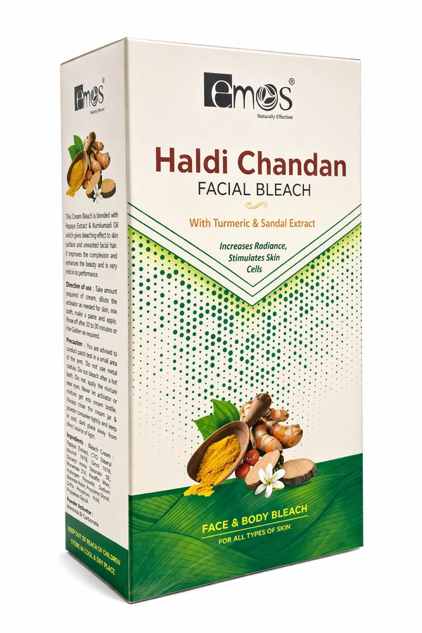 Emos Haldi Chandan Bleach is enriched with the goodness of turmeric and sandalwood extracts to gently lighten facial and body hair while enhancing skin glow. Its soothing formula helps improve skin clarity, brightness, and even tone without harshness. Suitable for men and women, this bleach delivers clean, radiant, salon-like results at home or in professional use.