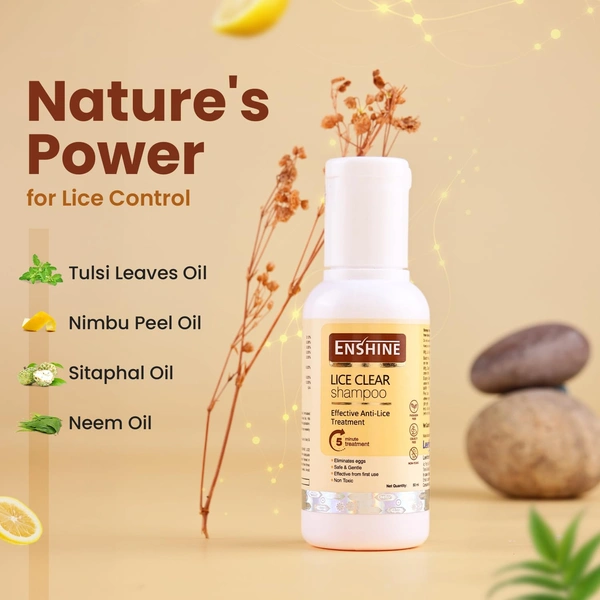 Enshine Lice Clear Shampoo is a gentle yet effective solution for removing head lice, nits, and eggs. Enriched with natural Neem and Tulsi, it helps cleanse the scalp, soothe irritation, and prevent reinfestation. Its non-toxic, paraben-free, and sulfate-free formula is safe for regular use by both children and adults, while keeping hair soft, healthy, and moisturized.