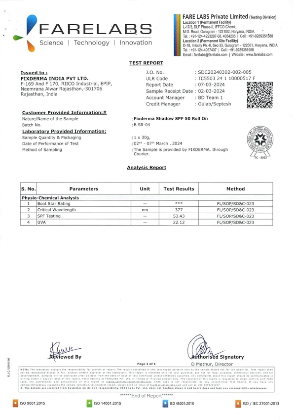 Fixderma Shadow Sunscreen Roll On SPF 50 PA+++ offers convenient transparent sun protection that glides easily on skin without white cast or heavy feel. Its lightweight formula provides broad spectrum UVA & UVB defence while being gentle enough for sensitive skin. Water resistant and easy to reapply anytime, this roll-on sunscreen is ideal for face, neck, arms & body for daily outdoor and travel sun exposure for both women & men.