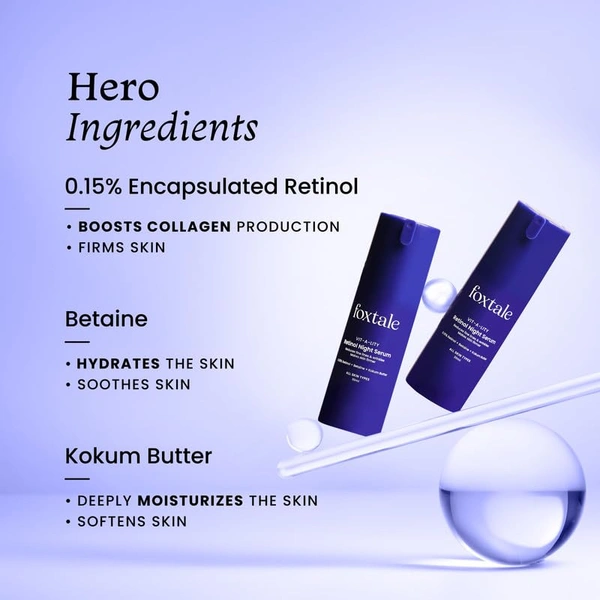 Foxtale Retinol Night Serum - 30ml | with 0.15% Retinol + Betaine + Kokum Butter | Reduce Fine Lines & Wrinkles | Minimize Pores | Youthful Skin | Skin brightening | Anti-Aging Night Cream | For All Skin Types