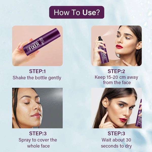 hake well before use to mix the ingredients. Hold 15-20 cm away from your face. Close your eyes and mouth, then spray evenly. Let it dry naturally for a long-lasting makeup hold.Reviews and Ratings