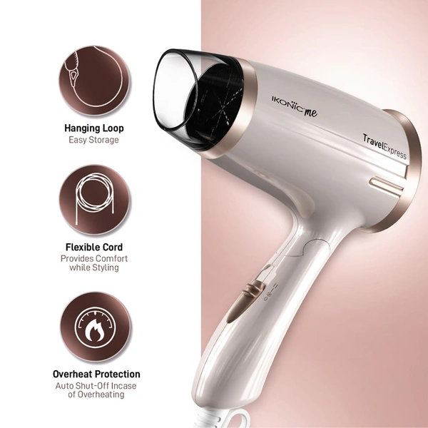 Ikonic Hair Dryer Travel Express Foldable | 1400W Fast Drying | 2 Speed Settings | Compact & Lightweight | Travel-Friendly | For Men & Women | All Hair Types
