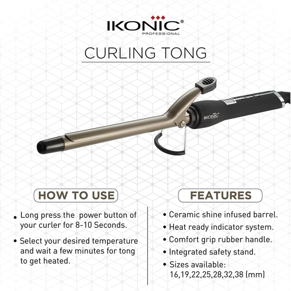 Ikonic Curling Tong-16mm, Ceramic shine infused barrel, Digital Display, Instant Heatup, Hair Curling With swivel cord Hair Styling, For Women, All Hair Type