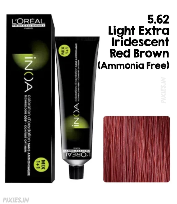 Discover luminous color with L'Oreal Professionnel INOA 5.62 Light Extra Iridescent Red Brown. The ammonia-free, oil-based formula offers radiant red-brown tones with superior shine and smooth texture. Enriched with ODS� technology, it nourishes hair while delivering 100% grey coverage and long-lasting, vibrant color. Ideal for all hair types, it ensures salon-quality results with less damage, improved comfort, and beautifully rich, glossy color.