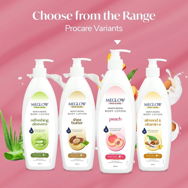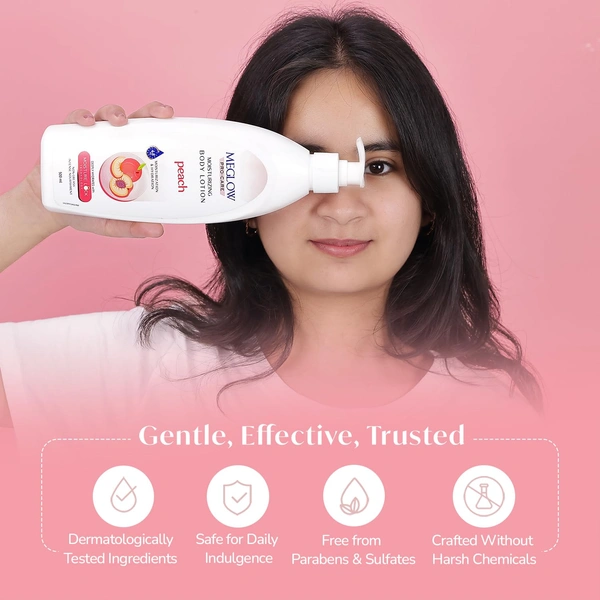 Meglow Pro-Care Moisturizer Body Lotion is enriched with Peach Extract to deeply hydrate and nourish dry skin. Powered with 48-hour moisture lock technology, it helps retain hydration, reduce dryness, and improve skin softness. The lightweight, fast-absorbing formula leaves skin smooth, refreshed, and comfortable all day. Ideal for daily use by women and men, especially for dry and rough skin.