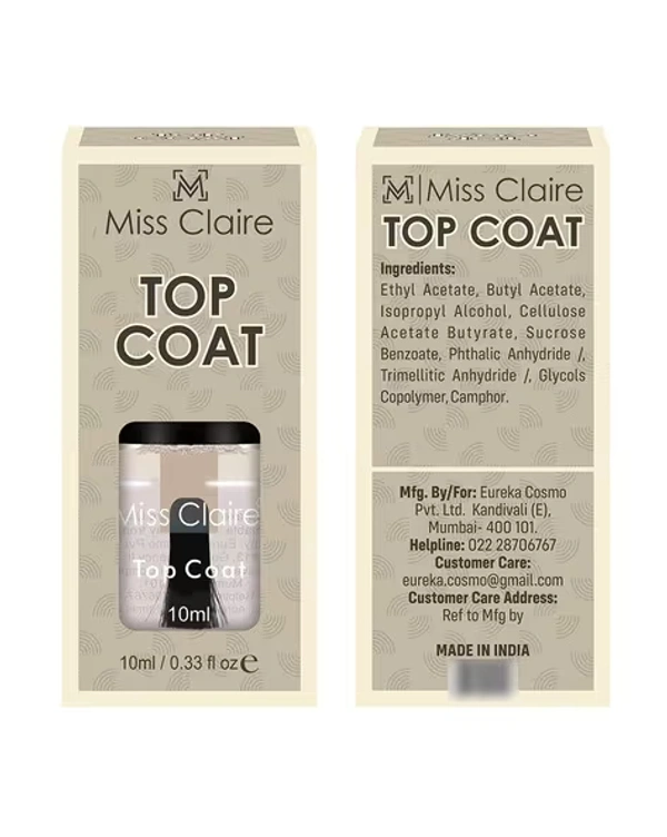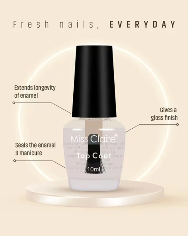 Miss Claire Top Coat Nail Polish 10ml | High Gloss Transparent Nail Top Coat | Long Lasting Shine & Protection | Quick Dry Formula | Prevents Chipping | Salon Finish Nails