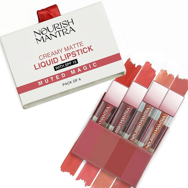 Nourish Mantra Muted Magic Creamy Matte Liquid Lipstick Combo with SPF 15, Set of 4 Mini Lipsticks 1.4ml each | Transfer-Proof, Smudge-Proof & Long-Lasting | Enriched with Jojoba Oil | Shea Butter & Vitamin E?