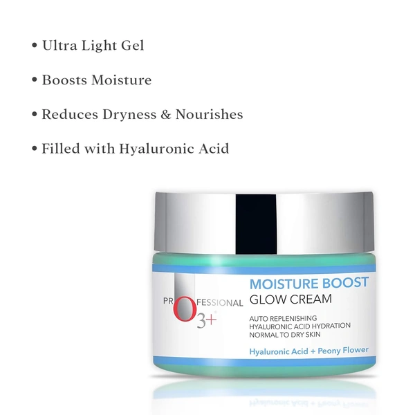 The O3+ Moisture Boost Glow Cream is a luxurious skincare product designed to hydrate and enhance your skin's natural radiance. Infused with powerful moisture-retaining ingredients, this cream works to deeply nourish and rejuvenate the skin, leaving it soft, supple, and glowing. Ideal for daily use, its lightweight yet rich formula absorbs quickly, delivering long-lasting hydration without feeling greasy. Whether used as a part of your morning or evening routine, the O3+ Moisture Boost Glow Cream helps to create a luminous, healthy complexion, perfect for all skin types.