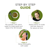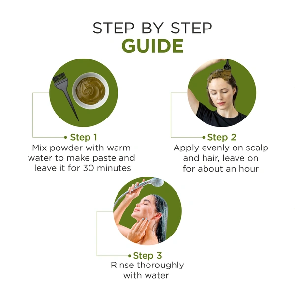 Mix required amount with lukewarm water into a smooth paste. Apply evenly to clean hair & scalp. Leave on for ~45-60 minutes. Rinse thoroughly; no shampoo required initially.Reviews and Ratings