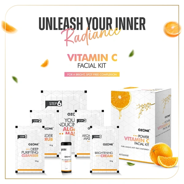 Ozone Radiance Vitamin C Facial Kit - Revitalize your skin with the Ozone Radiance Vitamin C Facial Kit, a complete skincare solution designed to bring out your natural glow. Infused with the power of Vitamin C, this 5-step facial kit deeply nourishes, hydrates, and brightens your skin, leaving it radiant and youthful. Perfect for combating dullness, pigmentation, and signs of aging, this kit provides a spa-like experience in the comfort of your home. Crafted with natural, skin-loving ingredients, it detoxifies, boosts collagen, and enhances skin elasticity. Whether for a special occasion or everyday care, this dermatologist-tested kit is safe for all skin types and ensures your skin feels refreshed, rejuvenated, and luminous. Elevate your skincare routine with the Ozone Radiance Vitamin C Facial Kit�your go-to for glowing, healthy skin