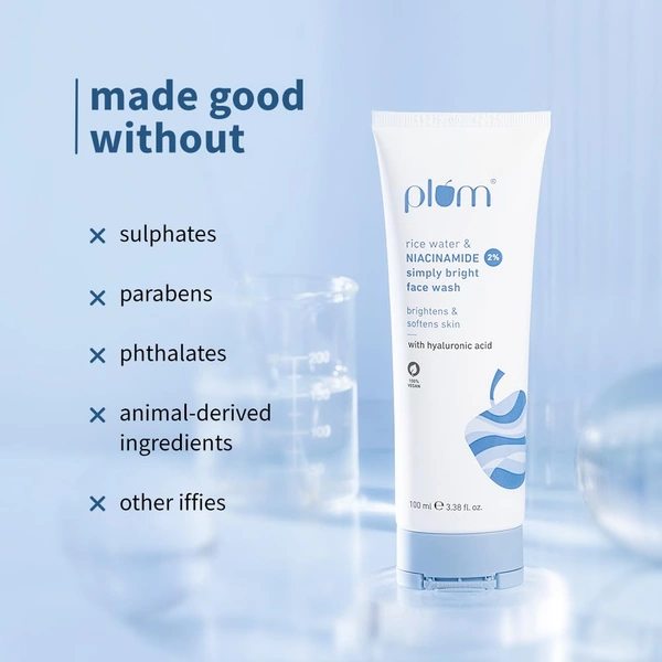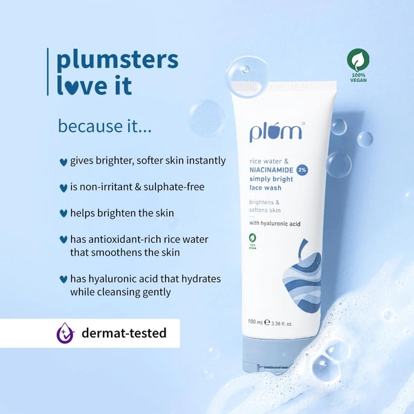 Plum 2% Niacinamide Simply Bright Face Wash 100ml | With Rice Water | Brightens & Smoothens Skin | Helps Fade Blemishes | Gentle, Non-Drying Cleanser | Vegan | Women & Men