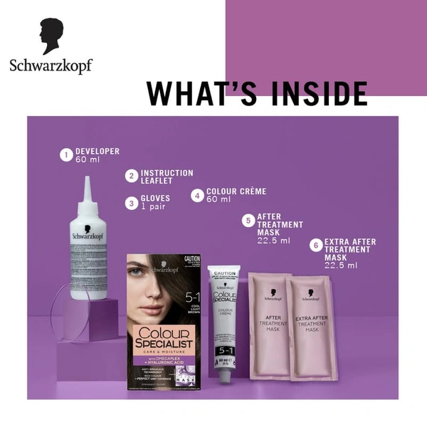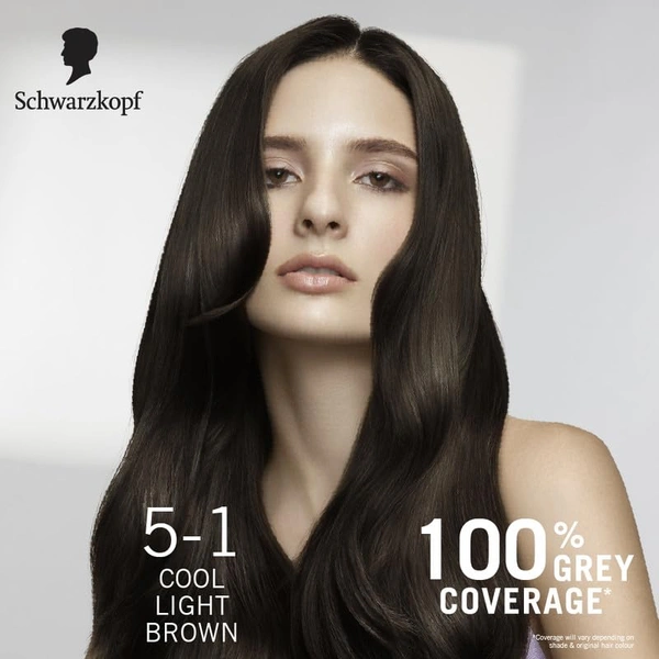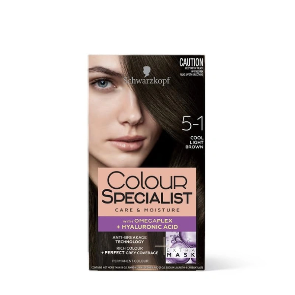 Schwarzkopf Colour Specialist 5.1 Cool Light Brown offers vibrant, cool-toned brown colour with 100% grey coverage. Enriched with Omegaplex Anti-Breakage Technology and Hyaluronic Acid, it protects and strengthens hair bonds while adding intense hydration. This fade-resistant, permanent formula delivers professional results with a natural-looking cool light brown shade. The creamy, no-drip texture ensures easy, mess-free application, leaving hair soft, shiny, and healthy-looking.