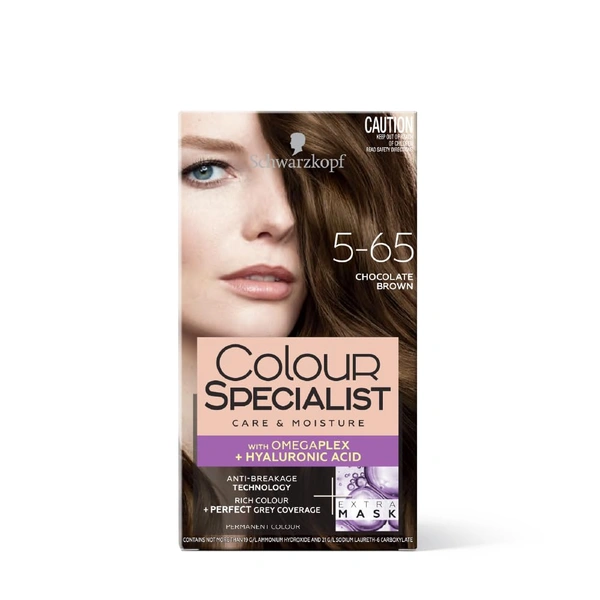 Schwarzkopf Colour Specialist 5.65 Chocolate Brown gives your hair a rich, luscious brown tone with 100% grey coverage. Infused with Omegaplex Anti-Breakage Technology and Hyaluronic Acid, it strengthens the hair structure while adding moisture and shine. This permanent hair colour delivers salon-quality results at home with a creamy no-drip formula. Enjoy long-lasting, fade-resistant colour, leaving your hair soft, hydrated, and beautifully vibrant.