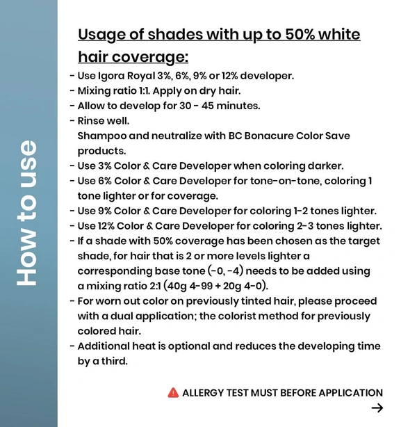 Mix with Igora Royal Oil Developer in a 1-2 ratio. Apply evenly to dry, unwashed hair. Leave on for 30-45 minutes, depending on desired lift. Rinse thoroughly, shampoo, and condition.Reviews and Ratings
