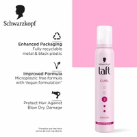 Schwarzkopf Taft Curl Hold 3 Hair Mousse delivers soft, bouncy curls with medium hold and frizz protection. This lightweight, silicone-free formula defines curls without crunch or stickiness, leaving your hair flexible and voluminous. Ideal for curly and wavy hair types, it provides long-lasting curl control, even in humid conditions. Easy to apply, vegan, and suitable for everyday styling to keep your curls looking natural and fresh