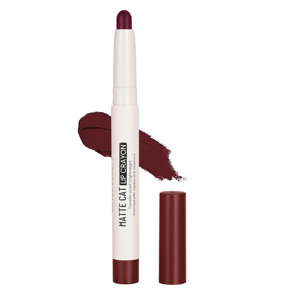 Swiss Beauty Cushy Evening Matte Cat Lip Crayon delivers a deep mauve shade with a smooth matte finish. Highly pigmented and infused with Vitamin E & Jojoba Oil, it keeps lips soft and moisturized while offering up to 8 hours of smudge-proof and waterproof wear. The lightweight, velvety formula glides effortlessly, ensuring a comfortable feel all day. Perfect for any occasion, this lip crayon enhances your lips with a bold, long-lasting color.
