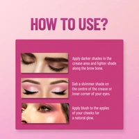 Apply eyeshadow using a brush or fingertip, blending as desired. Use shimmer shades for a glam effect and matte for depth. Sweep the blusher onto cheeks for a radiant glow. Blend well for a flawless, party-ready look.Reviews and Ratings