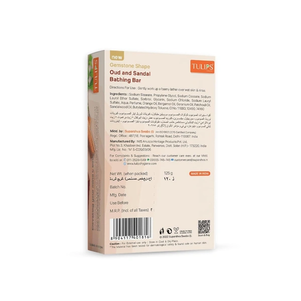 Tulips Handmade Bathing Bar Soap, Gemstone Shape Oudh & Sandalwood offers a luxurious and aromatic experience with every use. Infused with Oudh and Sandalwood, this soap deeply nourishes and hydrates your skin, leaving it soft, smooth, and delicately scented. The rich, woody fragrance of oud combined with the warm, calming scent of sandalwood creates a relaxing bathing experience that rejuvenates your senses. Handmade with natural ingredients, this soap is free from harsh chemicals, making it ideal for all skin types, including sensitive skin. Its unique gemstone shape adds an element of elegance and charm to your skincare routine, making every bath a luxurious moment.