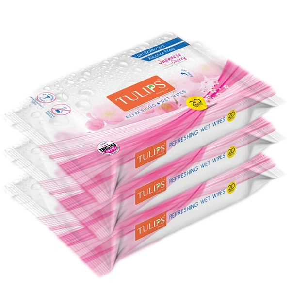 Tulips Japanese Cherry Refreshing Wet Wipes, 20 Wipes per Pack, Set of 3 | Soft, Gentle & Refreshing for Skin | Ideal for On-the-Go Cleansing & Freshness
