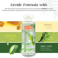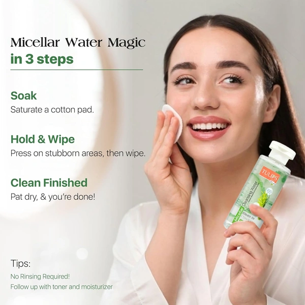 Prepare the Cotton Pad: Pour a small amount of Tulips Micellar Cleansing Water onto a cotton pad. Gently Wipe Over Face: Gently swipe the cotton pad across your face, including lips and eyes, to remove makeup and impurities. For waterproof makeup, hold the pad on the area for a few seconds to dissolve the makeup. Repeat if Necessary: If there�s still makeup residue, use a fresh cotton pad with more micellar water and gently wipe again. No Rinsing Needed: After cleansing, there�s no need to rinse your face. The micellar water leaves your skin clean, hydrated, and refreshed. Finish Skincare Routine: Follow with your favorite toner, serum, or moisturizer to complete your skincare routine.Reviews and Ratings