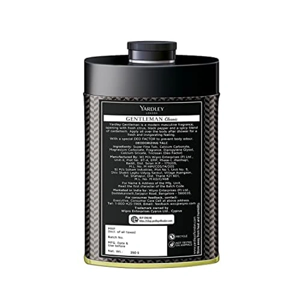 Yardley London Body Talc Gentleman Classic Deodorizing 250g for Men| Fresh Woody Scent | Masculine Fragrance |